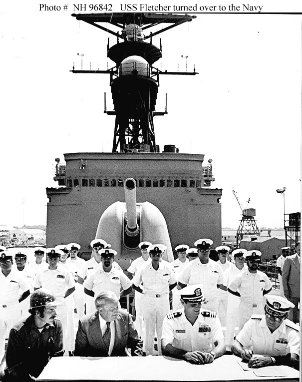 Photo #: NH 96842 USS Fletcher (DD-992) Rear Admiral William C. Wyatt, Supervisor of Shipbuilding at Pascagoula, Mississippi, signs the document accepting the ship from her builders, in ceremonies on board Fletcher at the Ingalls shipyard, 16 June 1980 . Looking on are Commander Steven C. Saulnier, the ship's Prospective Commanding Officer (2nd from right), Ingalls Shipbuilding President Len Erb (2nd from left) and George M. Nall (left), an Ingalls shipfitter who had worked on all thirty Spruance class destroyers and represented the entire Ingalls workforce at the ceremony. Fletcher was the final ship of the original thirty in that class. Courtesy of Ingalls Shipbuilding, Pascagoula, MS. U.S. Naval Historical Center Photograph. Online Image: 97KB; 605 x 765 pixels |