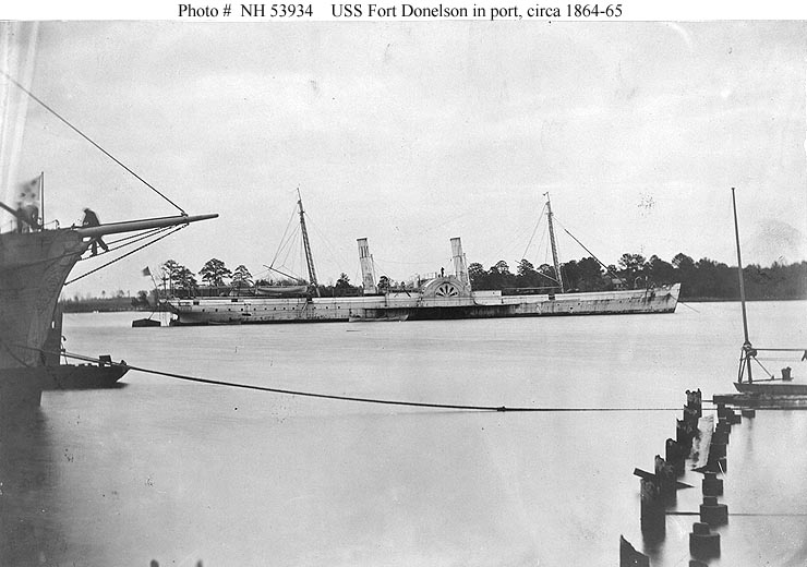USS Fort Donelson, a 642-ton iron-hulled side-wheel gunboat, was built in 1860 at Glasgow, Scotland, as the commercial steamer Giraffe. In 1862 she became the Confederate blockade runner Robert E. Lee and, during the next year, successfully penetrated the Federal blockade of the South more than twenty times. While attempting to reach Wilmington, North Carolina, on 9 November 1863, the ship was captured by the U.S. Navy ships James Adger and Iron Age.