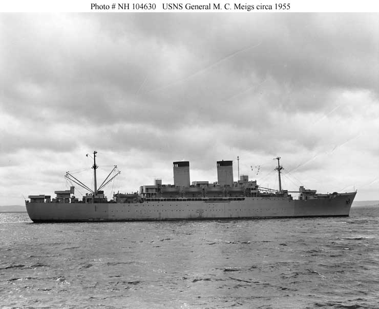 Photo #: NH 104661 USNS General M. C. Meigs (T-AP-116) Photographed after she joined Military Sea Transportation Service in July 1950 and before she received a modernization beginning in September 1953. Her appearance is little changed from World War II except for the removal of her armament. Official U.S. Navy Photograph, from the collections of the Naval Historical Center. Online Image: 67KB; 740 x 615 pixels |