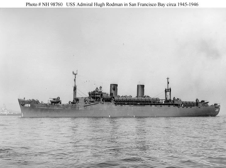USS Admiral Hugh Rodman, a 9,676-ton (light displacement) transport, was built by the Maritime Commission to its P2-SE2-R1 design as an Admiral W. S. Benson-class troop transport and was commissioned in July 1945. She was on her shakedown cruise off California when the Japanese surrender ended World War II. Between August 1945 and March 1946 she made five voyages from the U. S. west coast to the western Pacific, carrying occupation troops and relief personnel for veterans returning home. Admiral Hugh Rodman then transited to New York, where in May 1946 she was decommissioned and transferred to the Army.