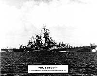 Photo #: NH 90736 USS Guam (CB-2) Halftone photo of the ship conducting main battery gunnery practice during shakedown off Trinidad, November-December 1944. Copied from the ship's wartime cruise book, "U.S.S. Guam: Her Story, 1944-1945". U.S. Naval Historical Center Photograph. Online Image: 97KB; 740 x 605 pixels |