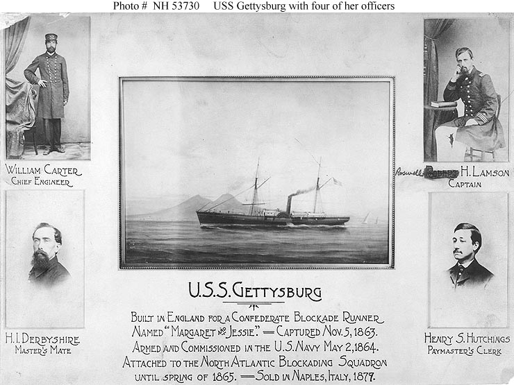 Photo #: NH 53730 USS Gettysburg (1864-1879) Montage featuring a painting of the ship (by De Simone, Naples, 1878) and views of four officers who served in her in 1864-1865. The officers are (clockwise from upper right): Lieutenant Roswell H. Lamson., Commanding Officer; Henry S. Hutchings, Paymaster's Clerk; Acting Master's Mate H.J. ("I" ?) Derbyshire; and Acting 3rd Assistant Engineer Enoch B. Carter (probably -- there is no Engineer named "William Carter" in contemporary Navy Registers). U.S. Naval Historical Center Photograph. Online Image: 96KB; 740 x 555 pixels |