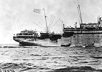 Photo #: NH 53887 USS George Washington (ID # 3018) View of the ship's after starboard side, taken while she was underway at sea on 10 May 1918. Photographed from USS Whipple (Destroyer # 15), which was then serving off western France. Note lifeboats suspended from George Washington's davits, ready position for quick launching, a necessary precaution while operating in the war zone. U.S. Naval History and Heritage Command Photograph. Online Image: 94KB; 740 x 545 pixels |