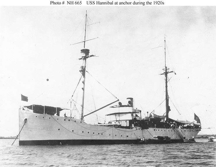 Hannibal was classified as a "miscellaneous auxiliary" in July 1920, with the hull number AG-1. Recommissioned some months later, she resumed her survey service early in 1921, primarily operating in the Caribbean. This work continued through the next two decades and lasted into World War II. She was also employed on the Chesapeake Bay degaussing range during the war. In August 1944 the now very elderly USS Hannibal was placed out of commission. She was sunk as a bombing target in March 1945.
