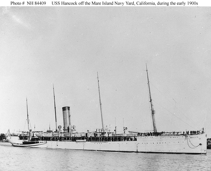 Photo #: NH 84409 USS Hancock (1902-1926, later AP-3) Off the Mare Island Navy Yard, California, during the early 1900s. Courtesy of Donald M. McPherson, 1976. U.S. Naval History and Heritage Command Photograph. Online Image: 74KB; 740 x 600 pixels |