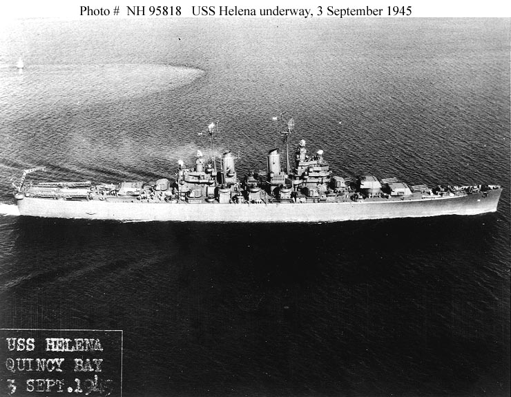 USS Helena, a 13,600 ton Baltimore class heavy cruiser, was built at Quincy, Massachusetts. Commissioned in September 1945, she took part in the Navy Day fleet review off New York City in October of that year. In February 1946, she went to European waters as flagship for the 12th Fleet. In May, she steamed through the Suez Canal to take station in the Far East on the first of her fourteen "WestPac" deployments.