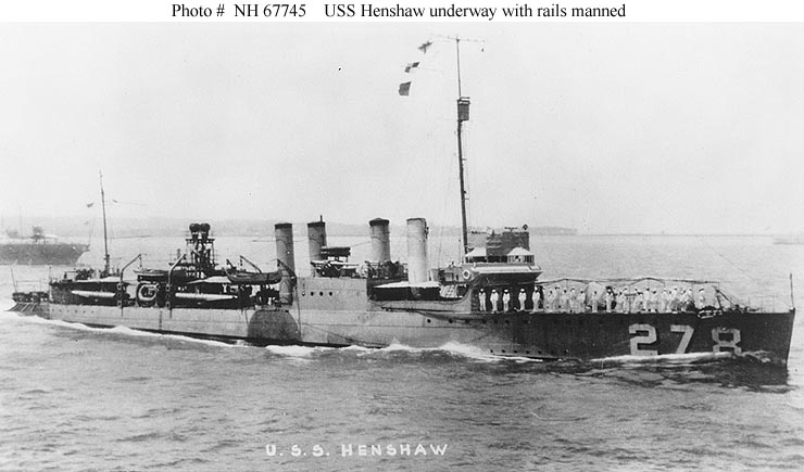 Photo #: NH 53521 USS Henshaw (DD-278) Underway near shore, circa the later 1920s. U.S. Naval Historical Center Photograph. Online Image: 72KB; 740 x 590 pixels |