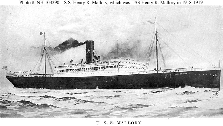 USS Henry R. Mallory, a 6200 gross ton transport, was built at Newport News, Virginia, in 1916 as a commercial passenger steamship. After the U.S. entered World War I she was employed by the War Department to take troops to France, and in April 1918 she was acquired by the Navy and soon placed in commission. For the remainder of the conflict, Henry R. Mallory continued the vital work of taking U.S. forces to the war zone. After the 11 November 1918 Armistice, she helped bring veterans of the "Great War" back to the United States. USS Henry R. Mallory was decommissioned in mid-September 1919 and transferred to the War Department about a month later.