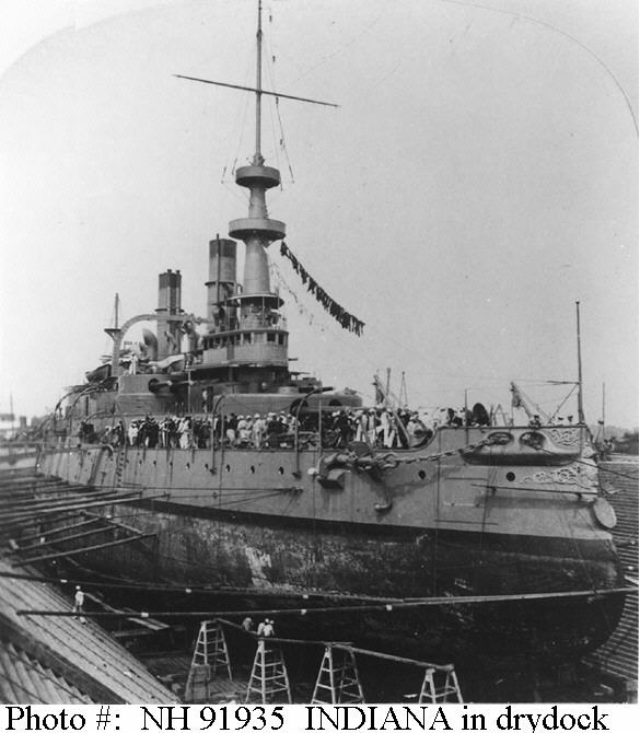 Photo #: NH 91935 USS Indiana (BB-1) In drydock at the New York Navy Yard, Brooklyn, NY, during 1898. U.S. Naval Historical Center Photograph. Online Image: 56,056 bytes; 585 x 670 pixels |