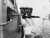 Photo #: NH 87 USS Iowa (Battleship # 4) Sailors and Marines of the ship's crew posed in front of her forward 12"/35 gun turret, circa August 1898. Photographed by William H. Rau. Note that Iowa has been partially repainted from wartime grey. Also note the ship's bell below the pilothouse. USS Brooklyn (Armored Cruiser # 3) is in the right distance. U.S. Naval Historical Center Photograph. Online Image: 110KB; 740 x 540 pixels |