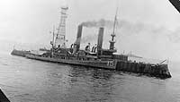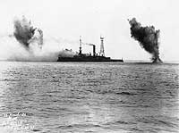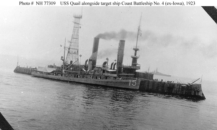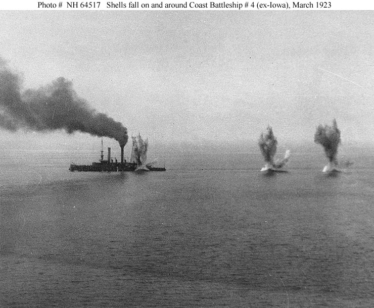 Early in 1923 the target ship finally went to sea and in February transited the Panama Canal to the Pacific, where she was to serve as a target for the battleship Mississippi's guns. With control from Shawmut and the minesweeper Quail standing by to perform necessary salvage and repair work, Coast Battleship No. 4 first was bombarded by five-inch secondary batteries, at ranges of some 8000 yards. Two further exercises, at longer range, placed her on the receiving end of more than three hundred fourteen-inch shells. The old ship sank in the Gulf of Panama after being hit by nearly three-dozen of these three-quarter ton projectiles.