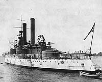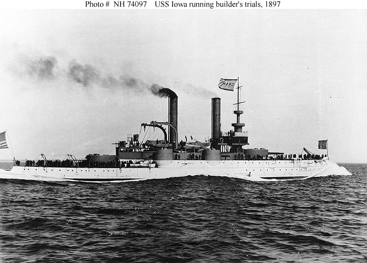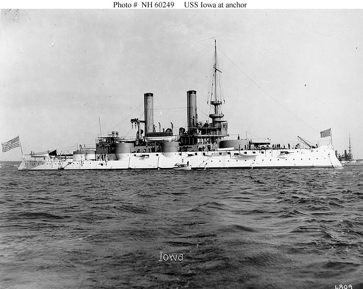 USS Iowa, a 11,410-ton battleship built at Philadelphia, Pennsylvania, was commissioned in June 1897. She operated along the Atlantic seaboard for the rest of that year and into 1898. During the Spanish-American War Iowa served off Cuba and on 3 July 1898 played an important role in the Battle of Santiago, an action that destroyed Spain's naval power in the Western Hemisphere. In October of that year, a few months after the conflict's end, the battleship was sent around South America to join the Pacific Squadron. She served along the West Coast until February 1902, when she began a year with the South Atlantic Squadron.