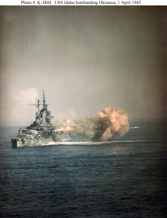 Photo #: 80-G-K-3829 (Color) USS Idaho (BB-42) Bombarding Okinawa with her 14"/50 main battery guns, 1 April 1945. Photographed from USS West Virginia (BB-48). Official U.S. Navy Photograph, now in the collections of the National Archives. Online Image: 86KB; 740 x 605 pixels Reproductions of this image may also be available through the National Archives photographic reproduction system. |