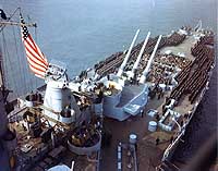 Photo #: DN-ST-85-05379 (Color) USS Iowa (BB-61) Fires a full broadside of nine 16"/50 and six 5"/38 guns during a target exercise near Vieques Island, Puerto Rico, 1 July 1984. Photographed by PHAN J. Alan Elliott. Note concussion effects on the water surface, and 16-inch gun barrels in varying degrees of recoil. Official U.S. Navy Photograph, from the the Department of Defense Still Media Collection. Online Image: 183KB; 740 x 605 pixels |