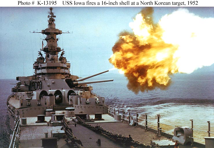 Photo #: NH 92213 USS Iowa (BB-61) Off Koje, Korea, Firing her 16-inch guns at enemy coastal defenses. Photo is dated 17 October 1952, the day after Iowa completed her Korean War combat operations. Courtesy of the U.S. Naval Institute Photographic Collection. U.S. Naval Historical Center Photograph. Online Image: 138KB; 740 x 615 pixels |