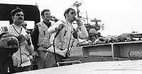 Photo #: NH 97719 USS Independence (CV-62) Lieutenant Michael F. Jordan (center), Landing Signal Officer of Attack Carrier Air Wing Seven (CVW-7), and two other landing signal personnel, man their stations during aircraft recovery on board Independence. The carrier was operating in the Mediterranean Sea. Photographed by PH1 Donald Grantham. This image was received by the Naval Photographic Center in October 1974. Official U.S. Navy Photograph, from the collections of the Naval Historical Center. Online Image: 76KB; 740 x 415 pixels |