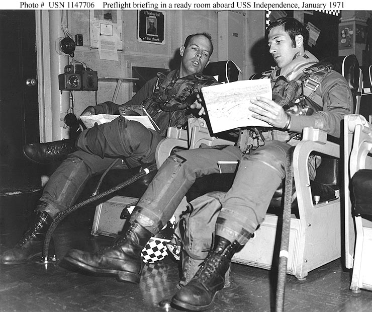 Photo #: USN 1147706 USS Independence (CVA-62) Lieutenant Christopher W. Galbreath and Lieutenant (Junior Grade) Louis P. Rottman participate in a preflight briefing in one of the carrier's ready rooms, during operations in the Mediterranean Sea, January 1971. Official U.S. Navy Photograph. Online Image: 112KB; 740 x 620 pixels Reproductions of this image may also be available through the National Archives photographic reproduction system as Photo # 428-N-1147706. |