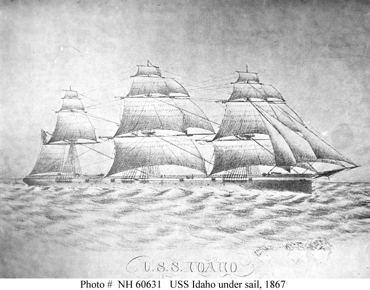 Photo #: NH 60631 USS Idaho (1866-1874) Artwork depicting Idaho under full sail following her conversion to a storeship. U.S. Naval Historical Center Photograph. Online Image: 104KB; 740 x 580 pixels |