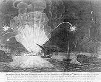 Photo #: NH 53248 "Blowing Up of the Fire ship Intrepid commanded by Capt. Somers in the Harbour of Tripoli on the night of the 4th Sepr. 1804" Contemporary line engraving. Text on the original, below the title line, reads: "Before the Intrepid had gained her Destined situation she was suddenly boarded by 100 Tripolines, when the Gallant Somers and Heroes of his Party, Lieuts. Wadsworth and Israel and 10 Men, observed themselves surrounded by 5 Gun-boats, and no prospect of Escape, determined at once to prefer Death and the Destruction of the Enemy, to Captivity & a torturing Slavery, put a Match to train leading directly to the Magazine, which at once blew the whole into the Air." Descriptions directly below the image are (from left to right): "Bashaw's Castle and Fort"; "Harbour of Tripoli"; "Fireship blowing up ..."; "Tripoline Gun Boats": and "American Squadron". U.S. Naval Historical Center Photograph. Online Image: 187KB; 740 x 625 pixels |