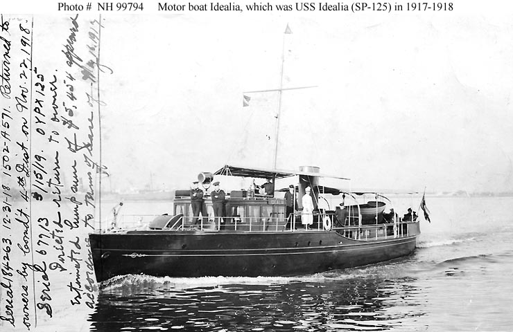USS Idealia, a 75' 8" motor pleasure boat, was built in 1911 by the Elco Company of Bayonne, New Jersey. She was acquired by the Navy under lease in May 1917 and placed in commission at that time as USS Idealia (SP-125). For the rest of World War I she served as a harbor entrance patrol craft in the Delaware Bay area. The boat was returned to her owner in November 1918, just eleven days after the 11 November Armistice brought the fighting to an end.
