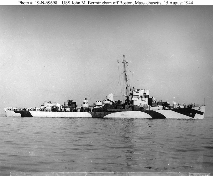 Photo #: 19-N-69702 USS John M. Bermingham (DE-530) Off Boston, Massachusetts, 15 August 1944. She is painted in Camouflage Measure 31 Design 1d. Photograph from the Bureau of Ships Collection in the U.S. National Archives. Online Image: 83KB; 740 x 610 pixels Reproductions of this image may also be available through the National Archives photographic reproduction system. |