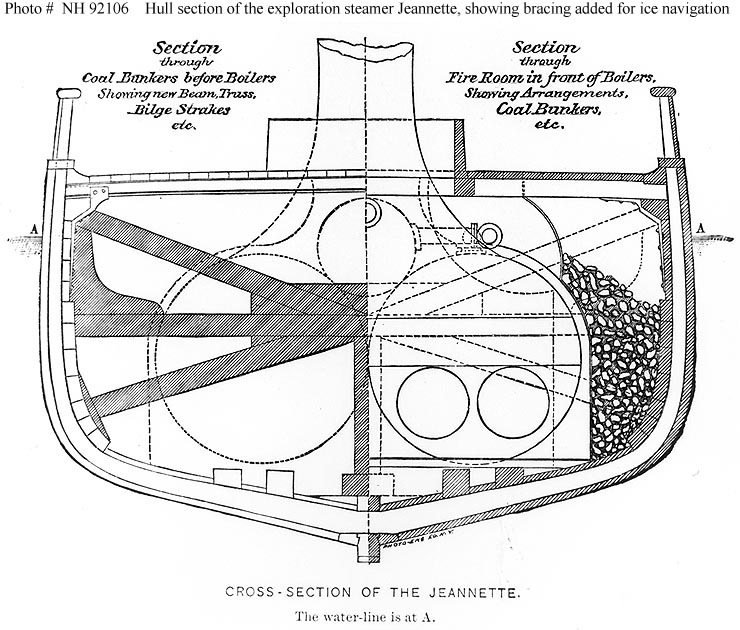 York newspaper publisher James Gordon Bennett in 1878 and renamed Jeannette. Lieutenant George W. DeLong, USN, who had collaborated with Bennett on a project to use the ship for an attempt to reach the North Pole, sailed her from Europe to San Francisco, California. Under the terms of a law authorizing the Navy to provide officers and crew for the proposed expedition, if Bennett paid for all other expenses, she was refitted at the Mare Island Navy Yard, in northern San Francisco Bay. In addition to receiving new boilers and other equipment, Jeannette's hull was massively reinforced to