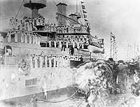 Photo #: NH 93731 USS Kearsarge (Battleship # 5) Crewmen, with arms linked, manning the rails and superstructure as the British Prince of Wales (the future King George V) leaves the ship after having lunch on board, at Portsmouth, England, 13 July 1903. Collection of Paymaster William R. Pattison, USN. U.S. Naval Historical Center Photograph. Online Image: 129KB; 740 x 590 pixels |