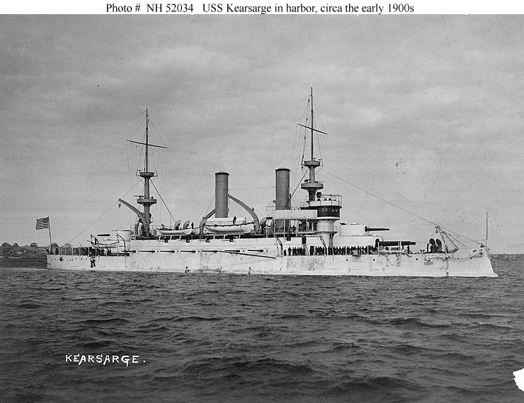 USS Kearsarge, first of a two-ship class of 11,525-ton battleships built at Newport News, Virginia, was commissioned in February 1900. She spent much of her first eight years operating along the U.S. East Coast and in the Caribbean area, much of the time as flagship of the North Atlantic Squadron. In addition, she steamed across the Atlantic for brief service as European Squadron flagship in June and July 1903 and for a Mediterranean cruise in mid-1904. On 13 April 1906 Kearsarge suffered a turret fire during target practice. One of a series of such tragedies that gave the Navy some difficult lessons in ammunition supply design and gunnery safety practices, this incident took the lives of ten officers and men.