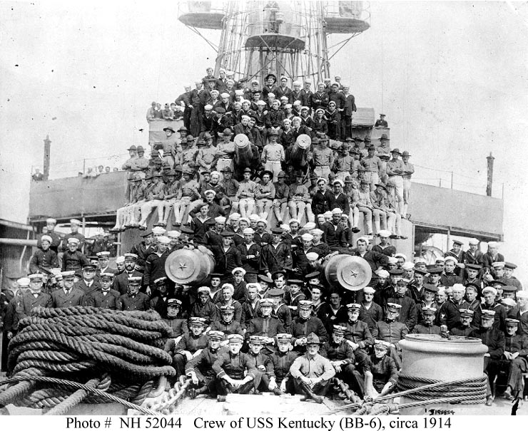 Photo #: NH 52044 USS Kentucky (BB-6) Ship's officers, crew and Marines, circa 1914. Most of the Marines are wearing khaki field uniforms. U.S. Naval Historical Center Photograph. Online Image: 145KB; 740 x 605 pixels |