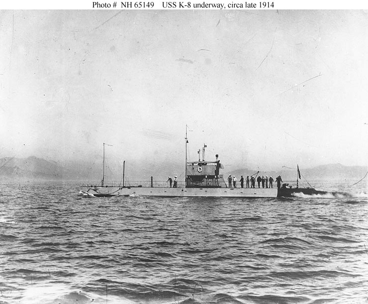 Photo #: NH 65149 USS K-8 (Submarine # 39) Underway circa late 1914, probably in San Francisco Bay, California. U.S. Naval Historical Center Photograph. Online Image: 90KB; 740 x 610 pixels |