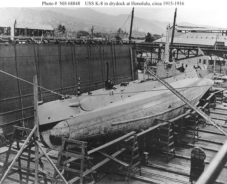 Photo #: NH 68848 USS K-8 (Submarine # 39) In drydock at Honolulu, Hawaii, circa 1915-1916. Courtesy of the San Francisco Maritime Museum, San Francisco, California, 1969. U.S. Naval Historical Center Photograph. Online Image: 125KB; 740 x 600 pixels |