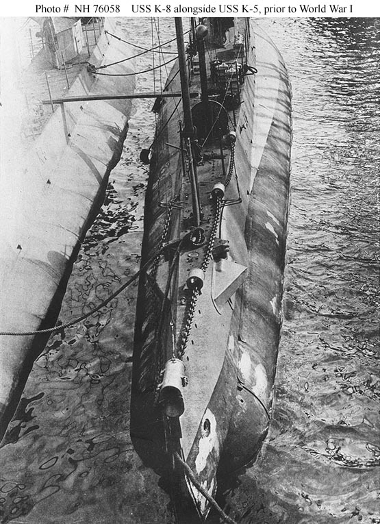 Photo #: NH 76058 USS K-8 (Submarine # 39) Tied up alongside USS K-5 (Submarine # 36), prior to World War I. Fine-screen halftone reproduction, published in "Sea Power" magazine, May 1917. U.S. Naval Historical Center Photograph. Online Image: 143KB; 555 x 765 pixels |
