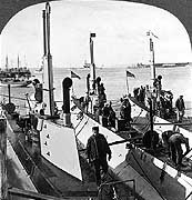 Photo #: NH 100348 USS K-8 (Submarine # 39), in center With two other submarines, at San Diego, California, circa 1915. Two destroyers and two cruisers are visible in the distance. Photo printed on a stereograph card, published by the Keystone View Company. Donation of Louis Smaus, 1985 U.S. Naval Historical Center Photograph. Online Image: 122KB; 625 x 675 pixels A stereo pair version of this image is available as Photo # NH 100348-A Online Image of stereo pair: 84KB; 675 x 365 pixels Note: See Photo # NH 100348 (extended caption) for the text printed on the reverse of the original stereo card, giving an immediate post-World War I popular evaluation of submarine warfare. |