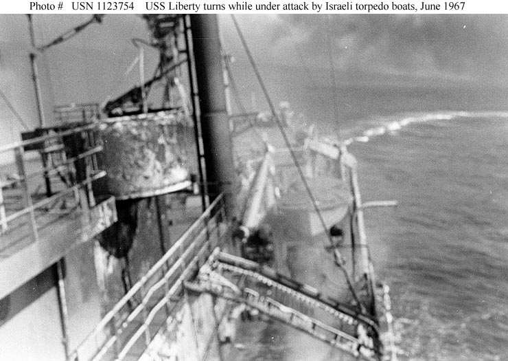 Photo #: USN 1123754 USS Liberty (AGTR-5) Turns while under attack by Israeli motor torpedo boats, off the Sinai Peninsula, 8 June 1967. Note fire-damaged structure at left, with what appears to be a .50 caliber machine gun. Official U.S. Navy Photograph. Online Image: 91KB; 740 x 525 pixels Reproductions of this image may also be available through the National Archives photographic reproduction system as Photo # 428-N-1123754. |