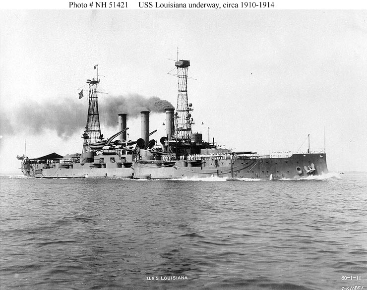 Photo #: NH 51421 USS Louisiana (Battleship # 19) Underway, circa 1910-14. U.S. Naval Historical Center Photograph. Online Image: 92KB; 740 x 585 pixels |