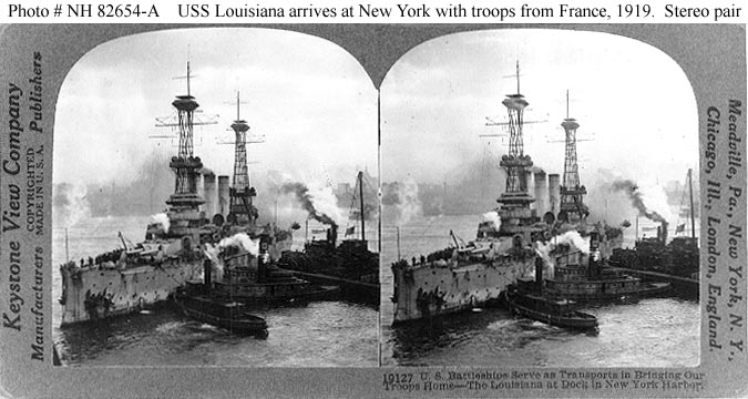 Photo #: NH 82654 USS Louisiana (Battleship # 19) Arrives at New York City with a load of troops from France, 1919. The tug Excelsior (closest to camera) is among those assisting her into her berth. Photo printed on a stereograph card, published by the Keystone View Company. See Photo # NH 82654 (extended caption) for the text printed on the original stereograph card's reverse side, concerning World War I trans-Atlantic logistics accomplishments. Courtesy of Commander Donald J. Robinson, USN(MSC), 1975 U.S. Naval Historical Center Photograph. Online Image: 95KB; 625 x 675 pixels A stereo pair version of this image is available as Photo # NH 82654-A Online Image of stereo pair: 62KB; 675 x 360 pixels |