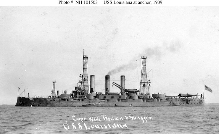 Photo #: NH 59575 USS Louisiana (Battleship # 19) Photographed in 1906 by Enrique Muller. U.S. Naval Historical Center Photograph. Online Image: 98KB; 740 x 535 pixels |
