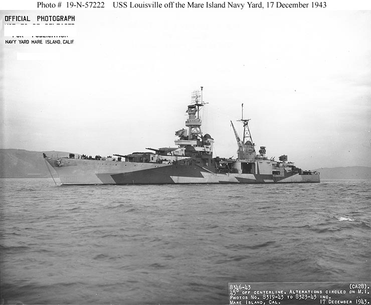 Photo #: 19-N-57222 USS Louisville (CA-28) Off the Mare Island Navy Yard, California, 17 December 1943. Her camouflage scheme is probably Measure 32, Design 6d. Photograph from the Bureau of Ships Collection in the U.S. National Archives. Online Image: 64KB; 740 x 610 pixels Reproductions of this image may also be available through the National Archives photographic reproduction system. |