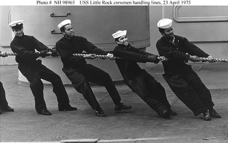 Photo #: NH 98965 USS Little Rock (CLG-4) Crewmen handle lines as the ship prepares to enter port at Gaeta, Italy, 23 April 1975. Taken by PHC A.A. Clemons. Official U.S. Navy Photograph, from the collections of the Naval Historical Center. Online Image: 63KB; 740 x 465 pixels |