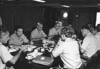 Photo #: USN 1157532 Vice Admiral Daniel Murphy, USN, Commander Sixth Fleet (center, wearing glasses) Confers with his task force commanders and senior staff on board the Fleet's flagship, USS Little Rock (CLG-4), at the time of the October 1973 Middle East war. Those present are identified in Photo # USN 1157532 (complete caption). Official U.S. Navy Photograph. Online Image: 92KB; 740 x 540 pixels Reproductions of this image may also be available through the National Archives photographic reproduction system as Photo # 428-N-1157532. |