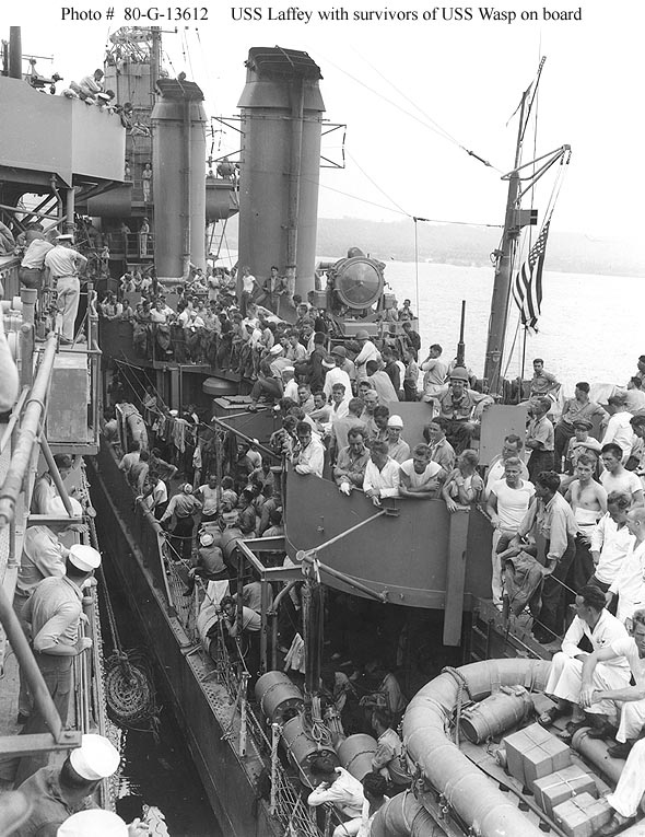 Photo #: 80-G-13612 USS Laffey (DD-459) Alongside a cruiser (either Salt Lake City or Pensacola) with survivors of USS Wasp (CV-7) on board, probably at Espiritu Santo, New Hebrides. Wasp had been sunk by a Japanese submarine on 15 September 1942. Note Laffey's smokestacks, Searchlight, mainmast, depth charges, and fully outfitted liferaft. Official U.S. Navy Photograph, now in the collections of the National Archives. Online Image: 128KB; 590 x 765 pixels Reproductions of this image may also be available through the National Archives photographic reproduction system. |