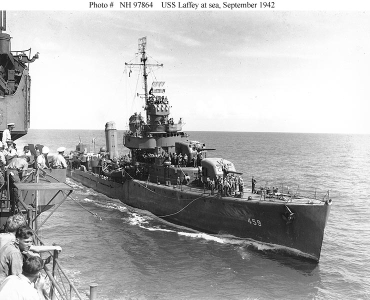 Photo #: NH 97864 USS Laffey (DD-459) Steams alongside another U.S. Navy ship, while at sea in the south Pacific on 4 September 1942. Official U.S. Navy Photograph, from the collections of the Naval Historical Center. Online Image: 97KB; 740 x 600 pixels |