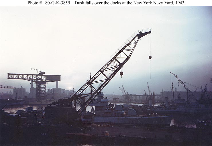 Photo #: 80-G-K-3859 (Color) New York Navy Yard, Brooklyn, New York Dusk falls over the Navy Yard docks, circa June-September 1943. The ship in the center, just beyond the crane, is USS Gherardi (DD-637). USS Luce (DD-522) is at left, with only her bow visible. USS Butler (DD-636) is at right, with only her stern visible. USS Doyle (DD-494) is in the right background. A British light cruiser, painted in yellow primer, is in the left background. Official U.S. Navy Photograph, now in the collections of the National Archives. Online Image: 53KB; 740 x 510 pixels Reproductions of this image may also be available through the National Archives photographic reproduction system. |