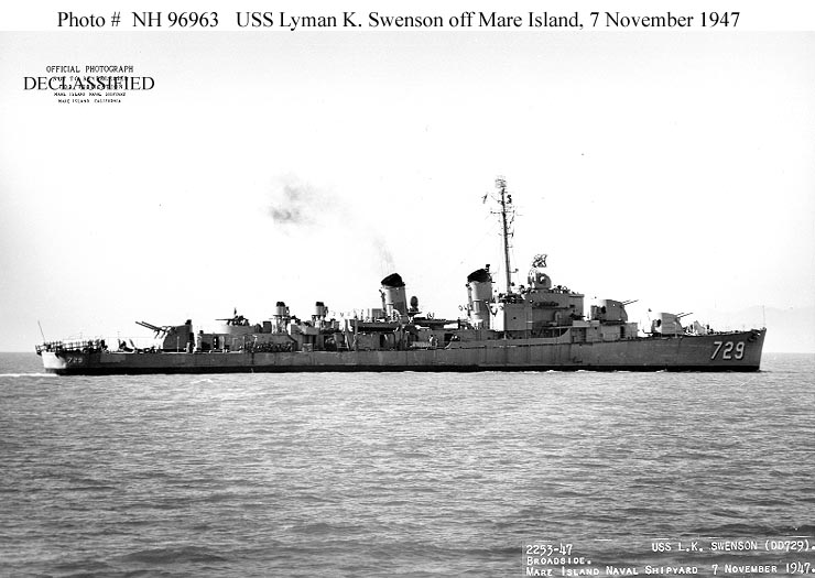 Photo #: NH 96964 USS Lyman K. Swenson (DD-729) Off the Mare Island Naval Shipyard, California, 7 November 1947. Official U.S. Navy Photograph, from the collections of the Naval Historical Center. Online Image: 61KB; 740 x 505 pixels |