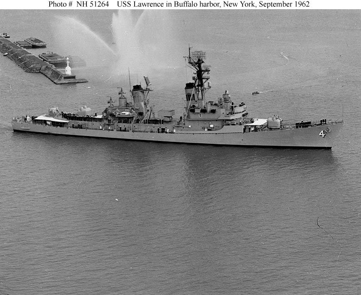 USS Lawrence, a 3370-ton Charles F. Adams guided-missile destroyer built at Camden, New Jersey, was commissioned in January 1962. She made a shakedown cruise on the Great Lakes and, in the Fall of 1962, took part in Cuban Missile Crisis operations in the Caribbean. In February 1963 Lawrence began the first of more than a dozen overseas cruises, steaming across the Atlantic to join the Sixth Fleet in the Mediterranean Sea. Further Mediterranean tours took place in 1964, 1965, 1966-67, 1968, 1969-70, 1971, 1977-78 and 1979. During the latter cruise, in June 1979, she briefly visited the Black Sea. Lawrence also passed through the 6th Fleet area en route to deployments in the Indian Ocean and Persian Gulf areas that took place in 1974-75, 1980 and 1983.