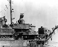 Photo #: 80-G-330108 USS Lindsey (DM-32) View of extensive damage to the ship's forward hull and superstructure, received when she was struck by two Kamikaze planes off Okinawa on 12 April 1945. The photograph was taken at Kerama Retto anchorage on 14 April. Official U.S. Navy Photograph, now in the collections of the National Archives. Online Image: 105KB; 740 x 625 pixels Reproductions of this image may also be available through the National Archives photographic reproduction system. |