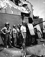 Photo #: 80-G-344369 USS Lindsey (DM-32) Crew of one of the ship's port forward 20mm guns pose by their weapon, at Guam, circa 16 June 1945. They had stuck to their post until knocked off their feet by the force of a second explosion, when Lindsey was struck by two Kamikaze planes off Okinawa on 12 April 1945. Note severely damaged plating in the vicinity. The men are (left to right): CM3c Edwin K. Kayden; GM3c Balanor Easebio; Y2c Chester F. Fluharty; S1c Fred M. Gorges; S1c Robert F. Zelenka. Official U.S. Navy Photograph, now in the collections of the National Archives. Online Image: 114KB; 590 x 765 pixels Reproductions of this image may also be available through the National Archives photographic reproduction system. |
