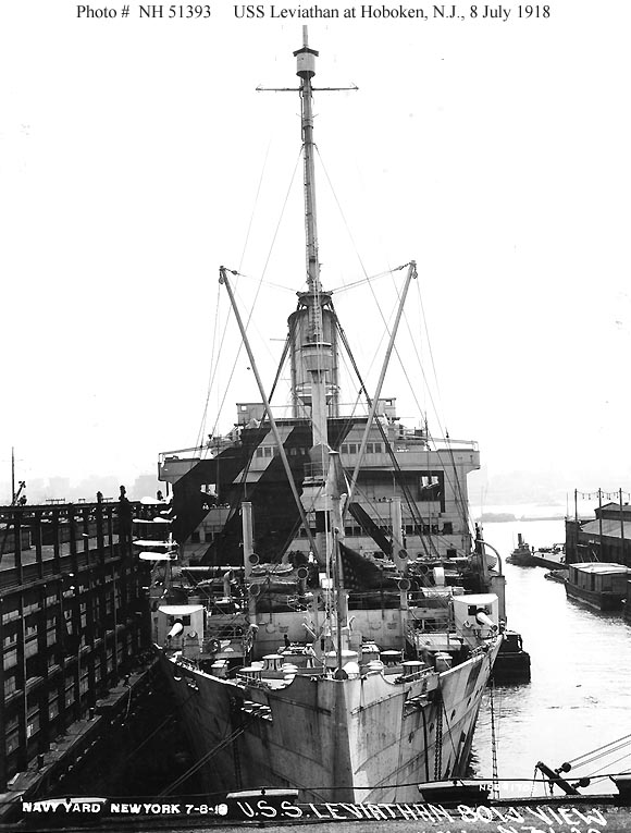 Photo #: NH 51393 USS Leviathan (ID # 1326) Docked at Hoboken, New Jersey, on 8 July 1918, while painted in "dazzle" camouflage. Photographed by the New York Navy Yard. U.S. Naval Historical Center Photograph. Online Image: 89KB; 580 x 765 pixels |