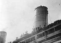 Photo #: NH 51336 USS Leviathan (ID # 1326) Returning from France with nearly nine thousand men on board, including about four thousand Sailors who had been on duty in the war zone. Photo shows scene on the deck of the ship, at its pier in Hoboken, New Jersey, with the men eagerly waiting the word to disembark, 16 December 1918. Note heavily riveted hull sides, six-inch gun, cargo boom and life rafts. U.S. Naval Historical Center Photograph. Online Image: 117KB; 740 x 585 pixels |