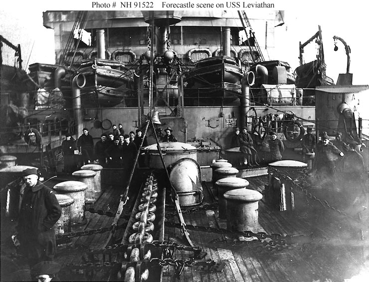 Photo #: NH 105967 USS Leviathan (ID # 1326) Chain of the ship's bow anchor, photographed looking forward on her fore deck, circa 1918-1919. Donation of Charles R. Haberlein Jr., 2008. U.S. Naval Historical Center Photograph. Online Image: 110KB; 535 x 765 pixels |